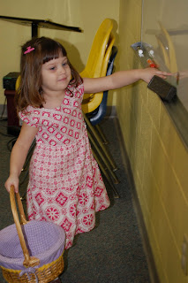 So like Avery's preschool class, Emma's preschool class also held an Easter egg hunt and party on Thursday. Unfortunately it rained pretty much all day on Thursday so they had to move the festivities inside the school. And as usual, I was on hand to help with the party and to take pictures.In the photo below, the class is lining up to begin the indoor Easter egg hunt. Doesn't Emma look super excited!?!